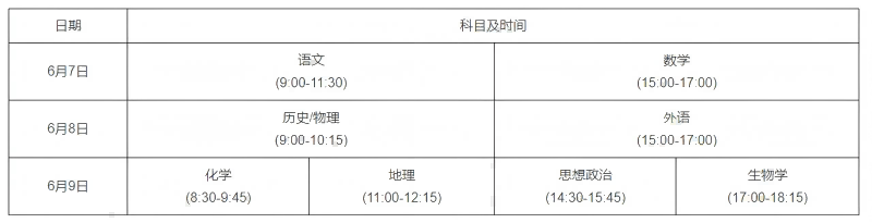 考试时间安排在6月7日-9日。其中,语文科目考试时长为150分钟,数学、外语(含听力)科目考试时长为120分钟,选择性考试科目考试时长均为75分钟。具体安排如下: